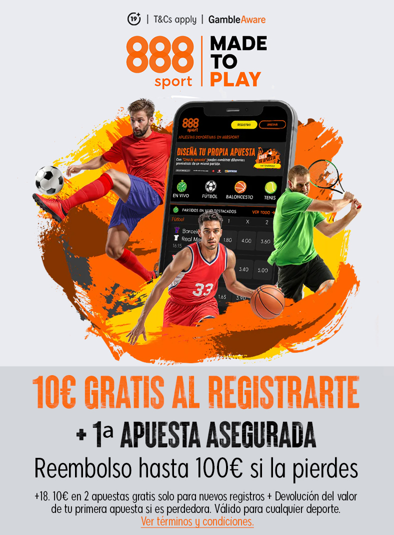 Si te apasiona el deporte y las apuestas online, 888sport te da la bienvenida con una promoción que no querrás dejar pasar. Al registrarte, recibirás 10€ en apuestas gratis para empezar a jugar en tus competiciones favoritas -ya sea apuestas fútbol, apuestas tenis, apuestas baloncesto o cualquier otro deporte - y, además, si tu primera apuesta resulta perdedora, te reembolsamos el 100% de lo apostado hasta 100€ en forma de apuesta gratis. Oferta válida a partir del 03/11/2025.
